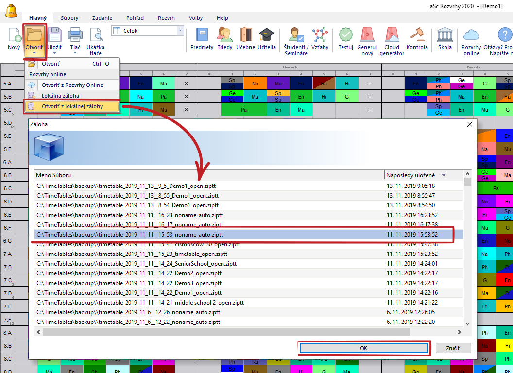 Vždy keď ukladáte rozvrh a navyše každých 30 minút, sa automaticky vytvára záloha v lokálnom priečinku na vašom PC.