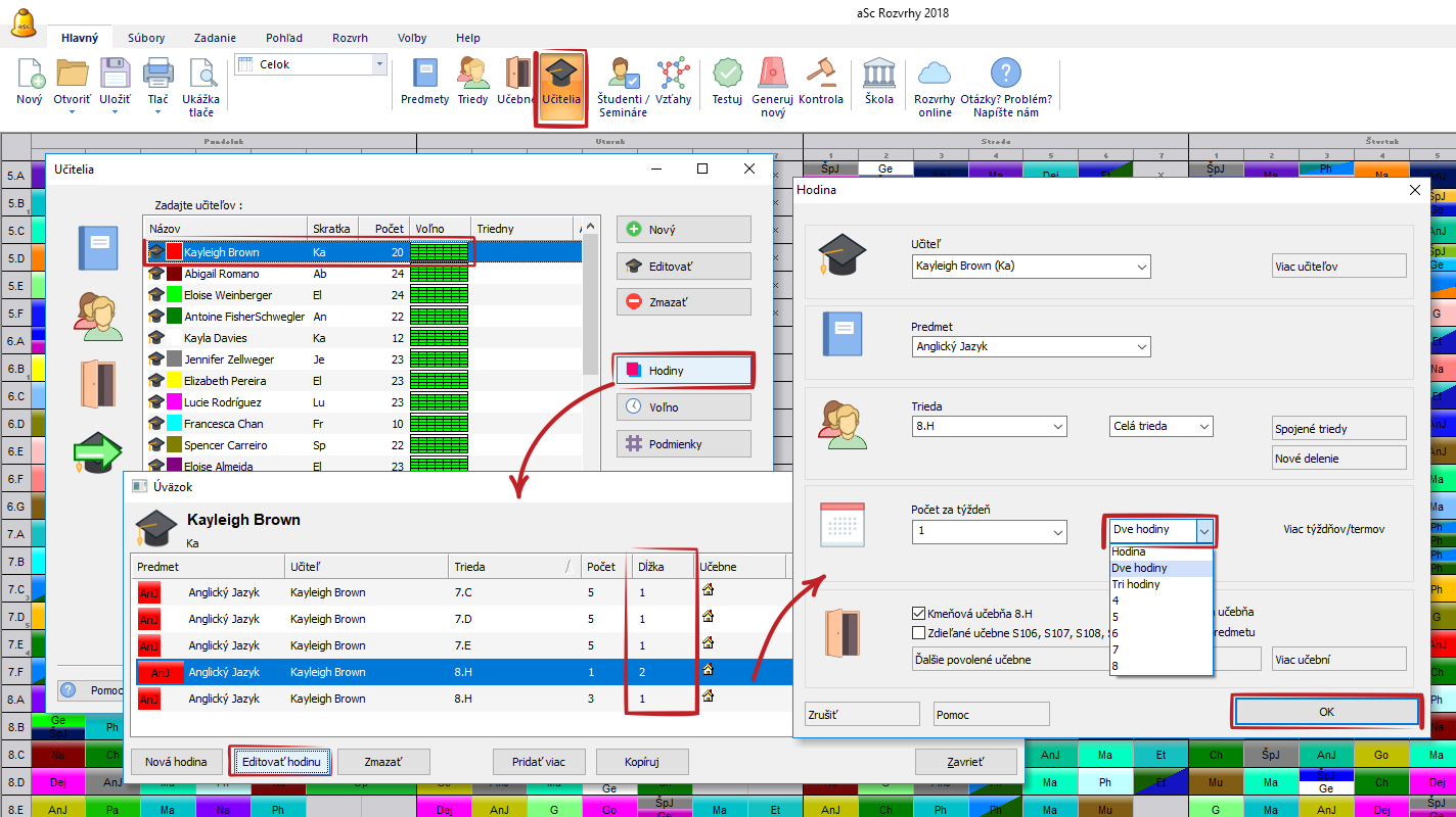 V prípade, ak potrebujete vytvoriť hodinu, ktorá trvá niekoľko vyučovacích hodín za sebou, môžete zvoliť jej "dĺžku" v dialógu "Hodina". Detailnejší opis môžete nájsť na tomto obrázku:
