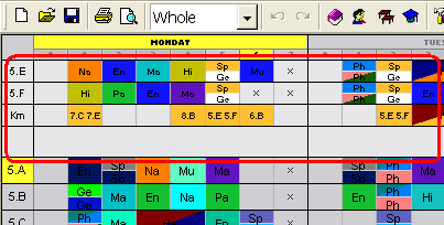 Po aktivovaní tejto funkcie sa hore nad rozvrhmi jednotlivých tried (učiteľov, učební) zobrazí nový svetlošedý panel:
