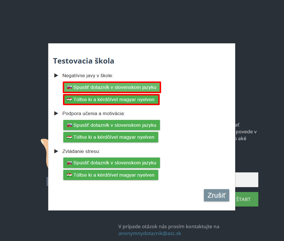 Ak ste v danom prieskume vybrali viac ako jeden dotazník, tak v ďalšom okne si respondent zvolí, ktorý z dotazníkov ide vypĺňať a v akom jazyku (alovensky alebo maďarsky) ho chce spustiť: