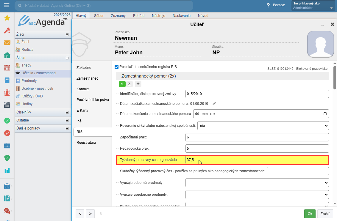Týždenný pracovný čas je automaticky prednastavená hodnota. Zobrazuje sa v karte zamestnanca v záložke RIS.