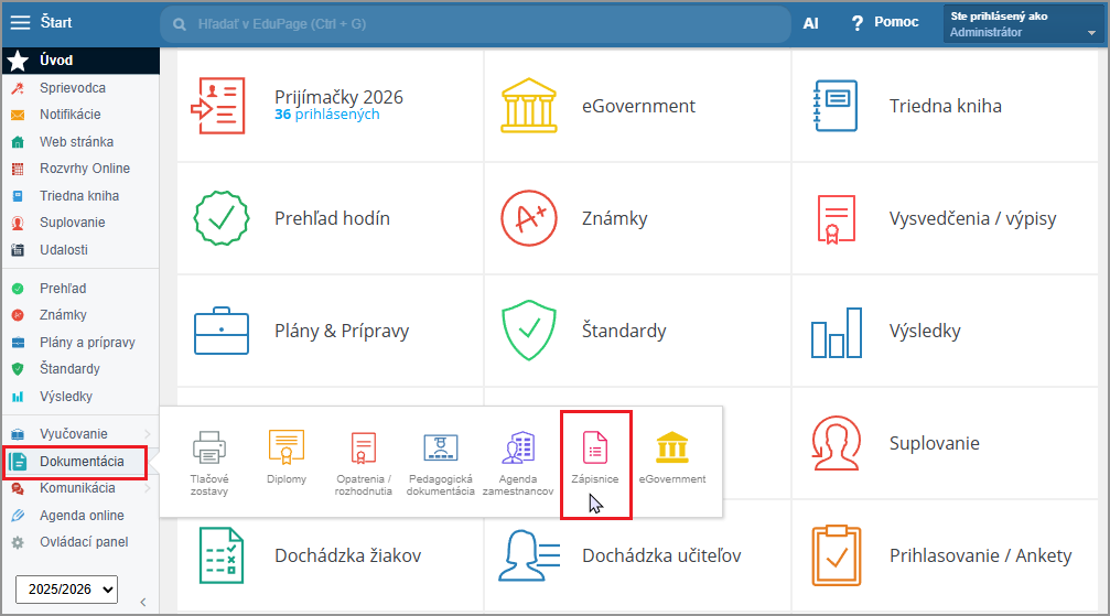 Prihláste sa na webe ako administrátor a v ľavom menu vyberte 'Zápisnice' v časti 'Dokumentácia'.