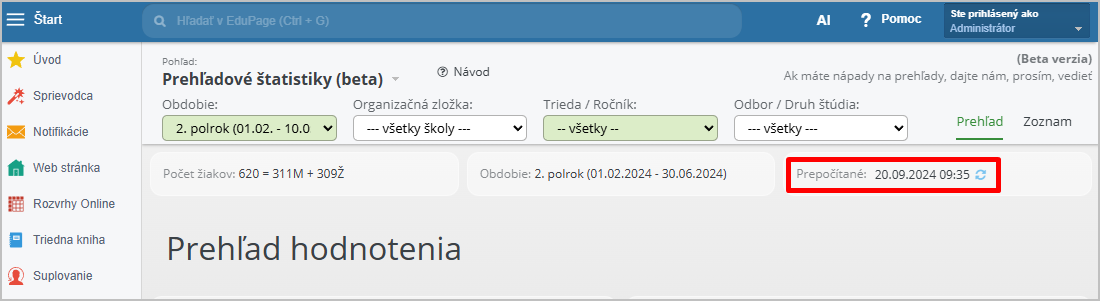 Čas posledného prepočítania vidíte v pravom hornom rohu. Údaje zobrazované v štatistikách sú k tomuto času.