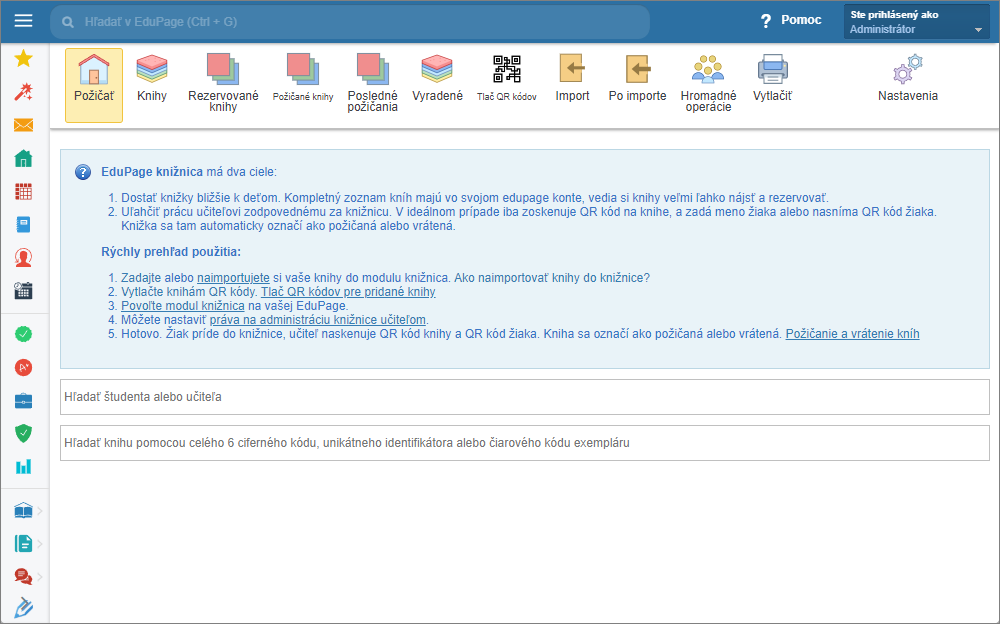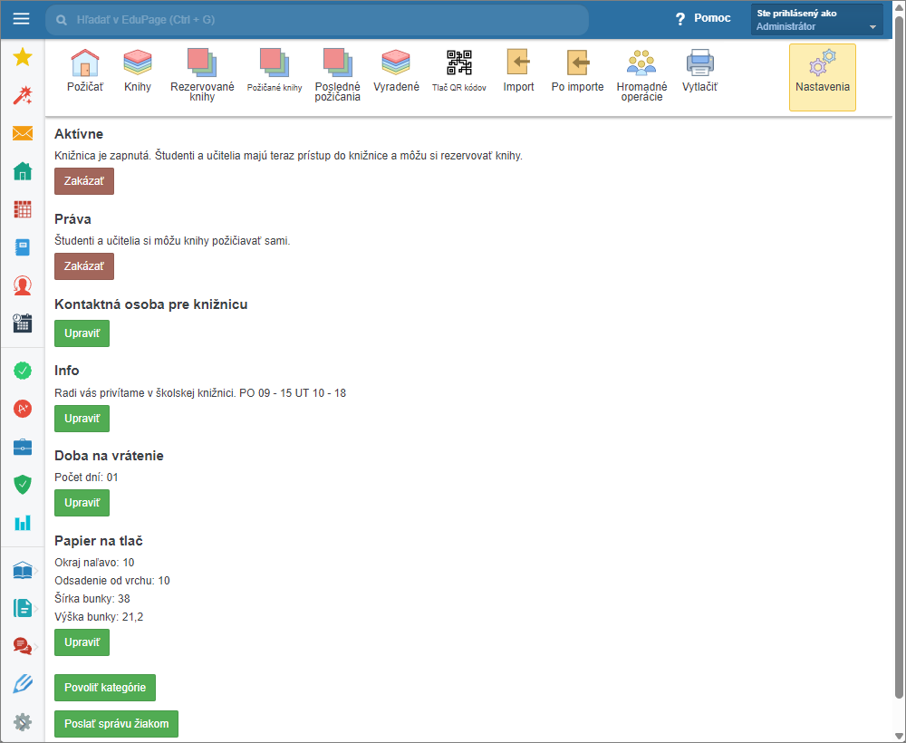 Viete aktivovať, alebo deaktivovať modul Knižnica, umožniť požičiavanie kníh učiteľom a žiakom, nastaviť kontaktnú osobu Knižnice, zadať informácie o knižnici, ktoré uživatelia uvidia, nastaviť dobu na vrátenie, nastaviť veľkosť štítkov QR kódov, povoliť rozsiahlejší zoznam kategórií, poslať správu žiakom