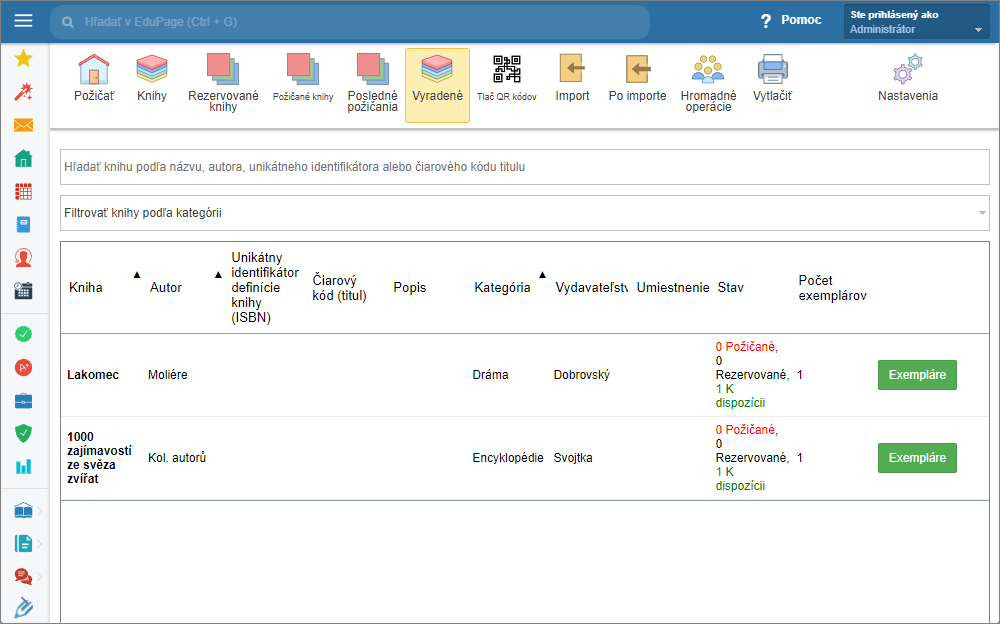 Vo webovej aplikácii máte prehľad o tituloch a ich exemplároch vo vašej Knižnici, viete pridávať a zmazať tituly a exempláre, upravovať ich vlastnosti, požičať, alebo vyradiť exempláre; na editáciu exemplárov, je potrebné vybrať “Exempláre” v riadku požadovaného titulu.