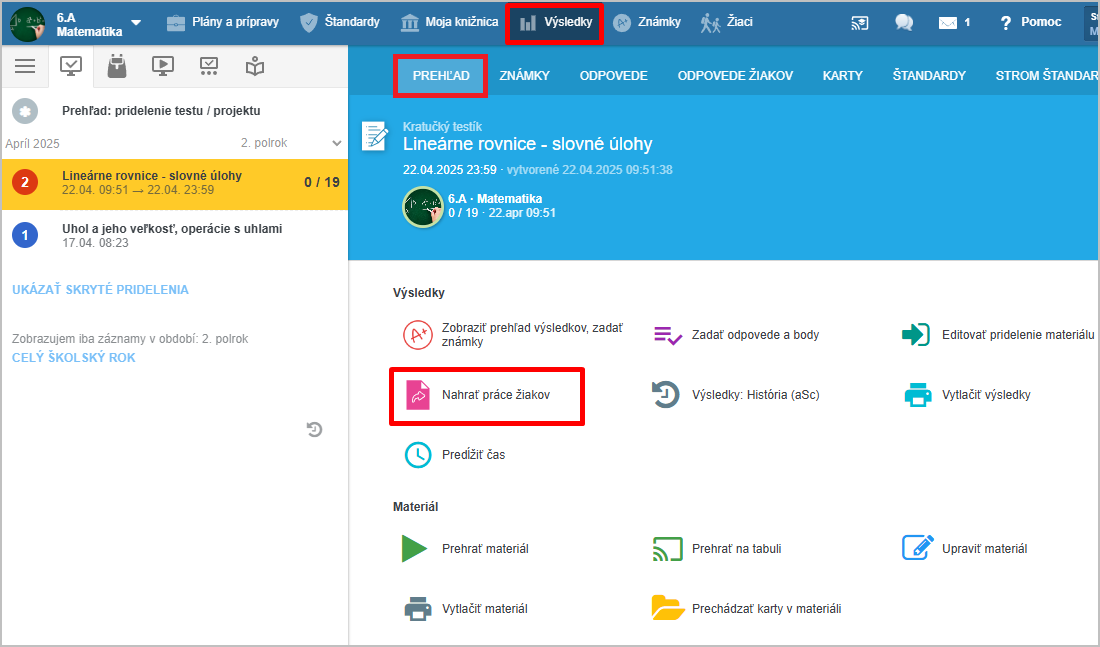 V časti "Výsledky - Prehľad" pre danú písomku vyberte funkciu Nahrať práce žiakov:
