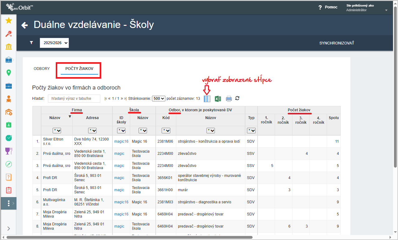 Zobrazia sa vám aktuálne zadané počty žiakov v jednotlivých vašich školách po firmách a odboroch: