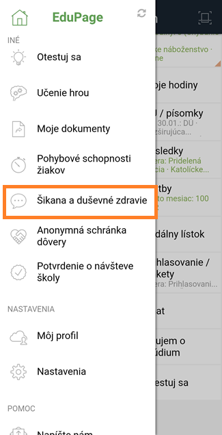 Otvor si aplikáciu EduPage a v hlavnom menu (ľavý panel) klikni na Šikana a duševné zdravie.