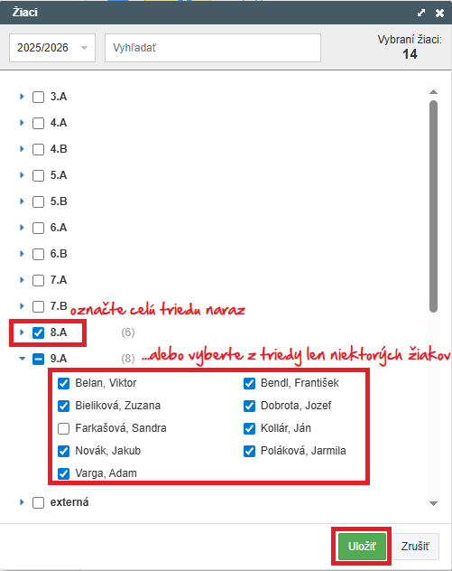 Následne kliknite na tlačidlo Žiaci: Vybrať.