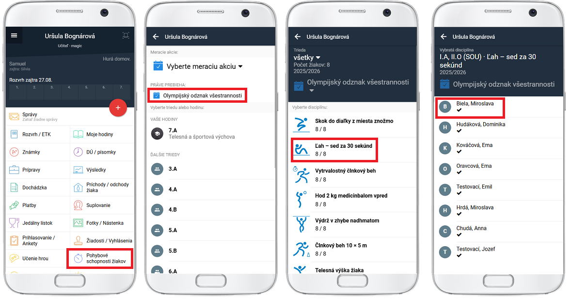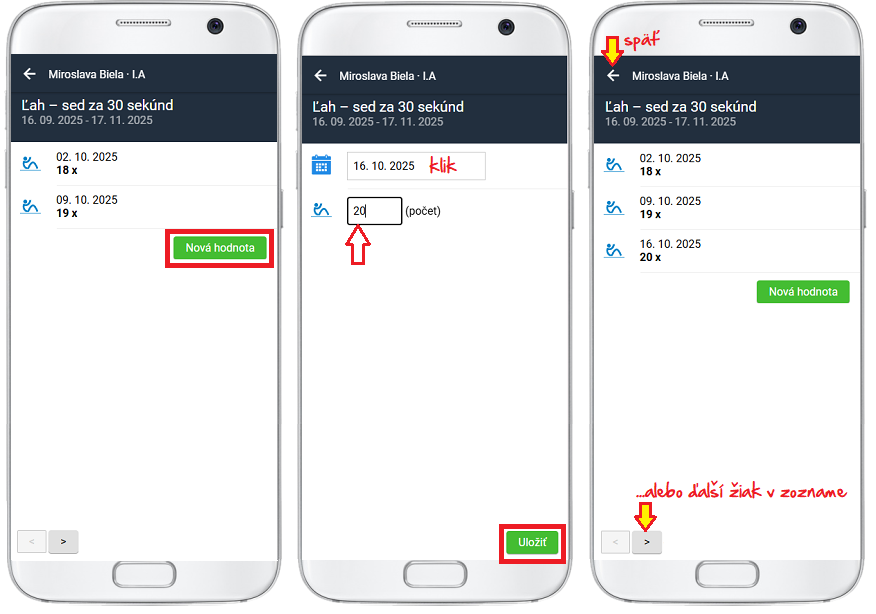 V module Testovanie pohybových schopností viete sledovať pokroky žiaka v disciplíne a zapisovať viac meraní pre jedného žiaka. Pri každom meraní zadáte dátum tohto výsledku.