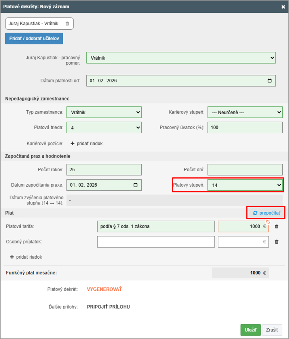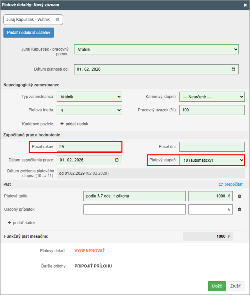 1. Ak je zamestnanec zaradený do platového stupňa na základe odpracovaných rokov, platový stupeň sa mu na platovom dekréte priradí automaticky, v tomto prípade nič nemeníte. Dekrét uložíte a dáte vygenerovať.