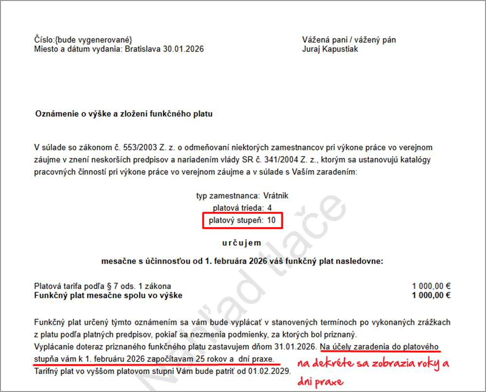 Na vygenerovanom platovom dekréte je uvedená prepočítaná suma; informácia o odpracovaných rokoch sa nezobrazuje.