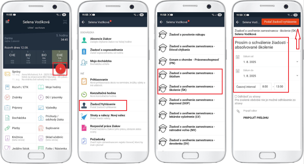 V mobilnej aplikácii stlačte červené tlačidlo + a vyberte potrebnú žiadosť. Vypíšte ju, zadajte dátum a žiadosť odošlite.