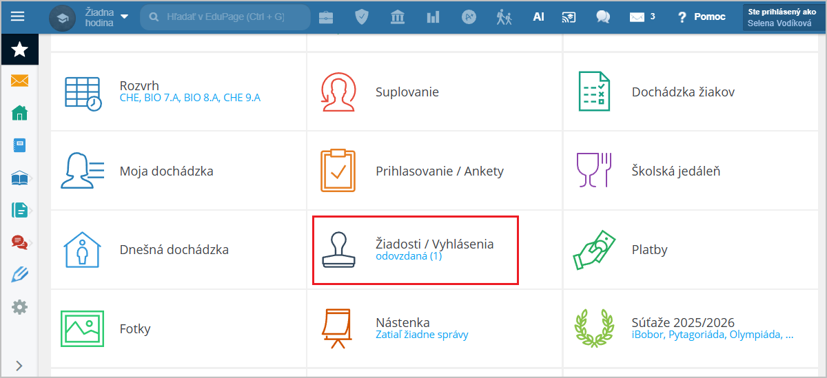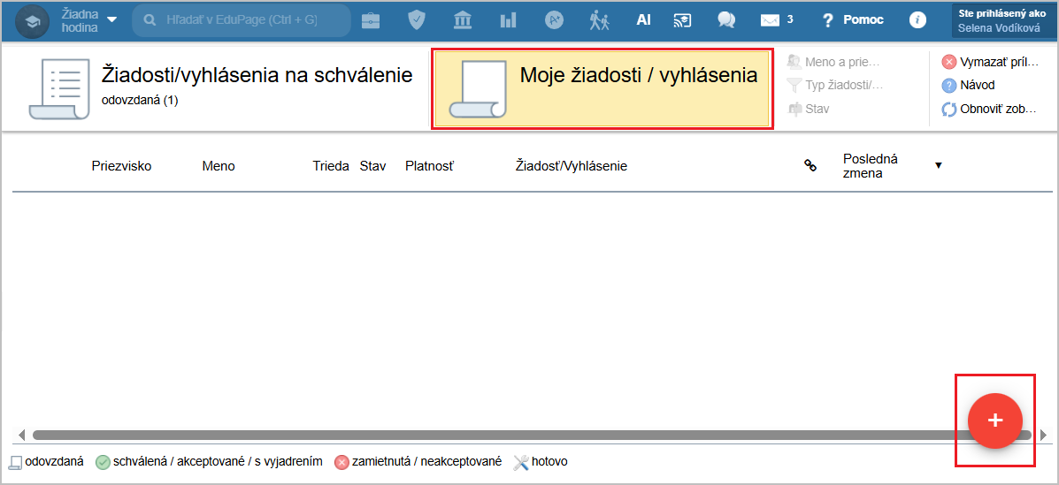 Prihláste sa do svojho učiteľského konta a v module 'Žiadosti / Vyhlásenia' pomocou červeného '+' vyberte konkrétny typ žiadosti:
