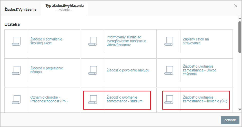 Ak to váš školský administrátor povolí, v EduPage môžete podať žiadosť o uvoľnenie zamestnanca elektronicky. V EduPage nájdete rôzne typy žiadostí o uvoľnenie - lekár, dovolenka, náhradné voľno, pracovné voľno alebo v prípade potreby univerzálnu žiadosť o uvoľnenie.