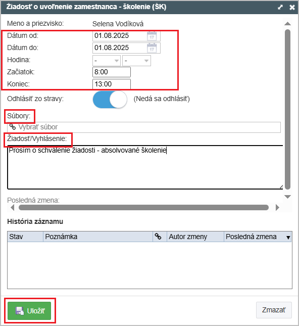 Zvoľte dátum čerpania a trvanie školenia/štúdia, vyplňte text žiadosti. Do žiadosti je možné vložiť prílohu.