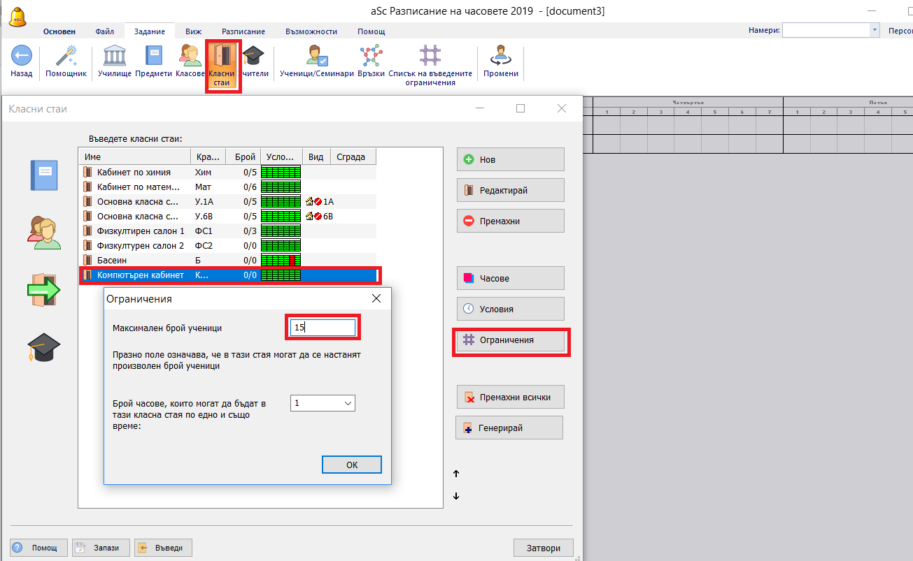 За всяка класна стая можете да обозначите максимален брой ученици, които тя може да поеме: