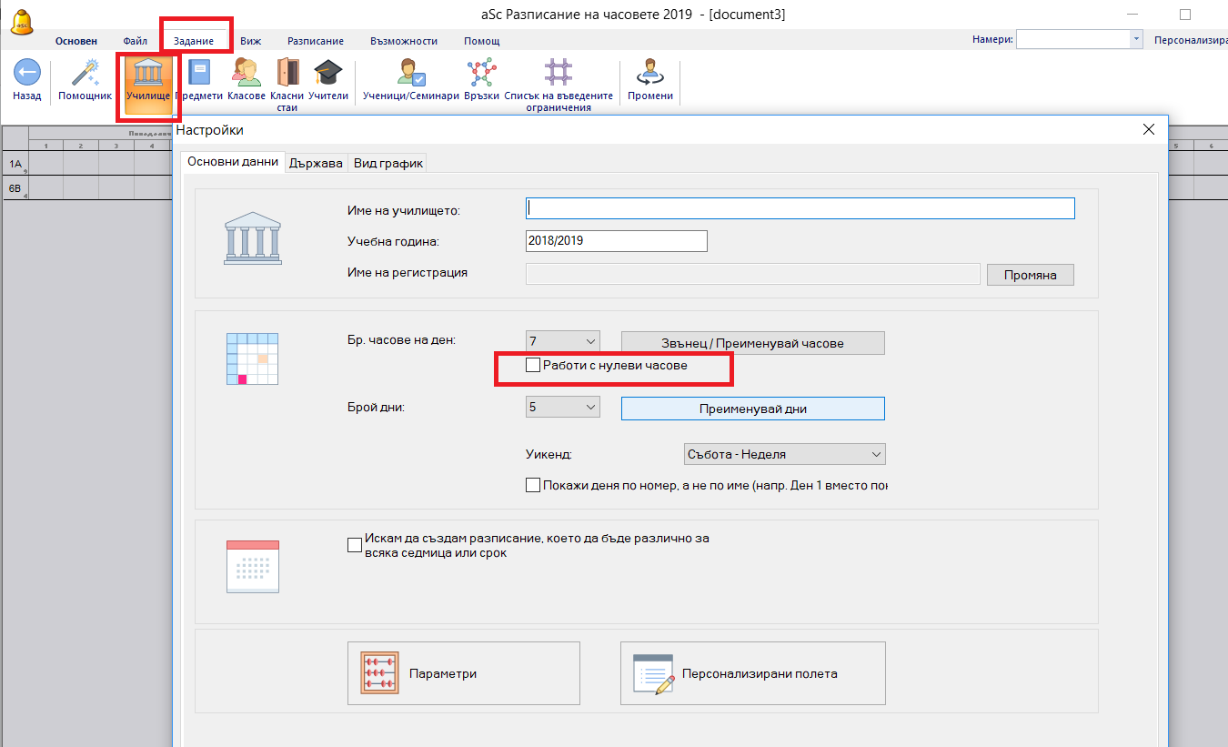 Ако Вашето училище не използва нулев час (час преди първия учебен час), може напълно да го премахнете в меню Задание/ Училище.
