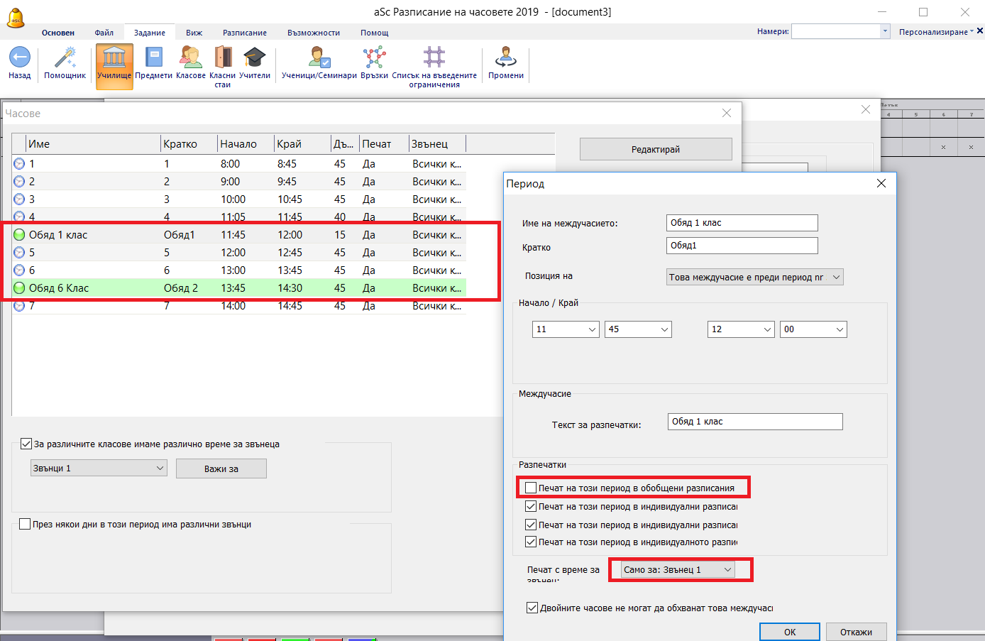 1. Добавете две обедни почивки. След това за първата обедна почивка отбележете, че само тя ще бъде принтирана в 1,2,3 клас (чрез Звънци 1):