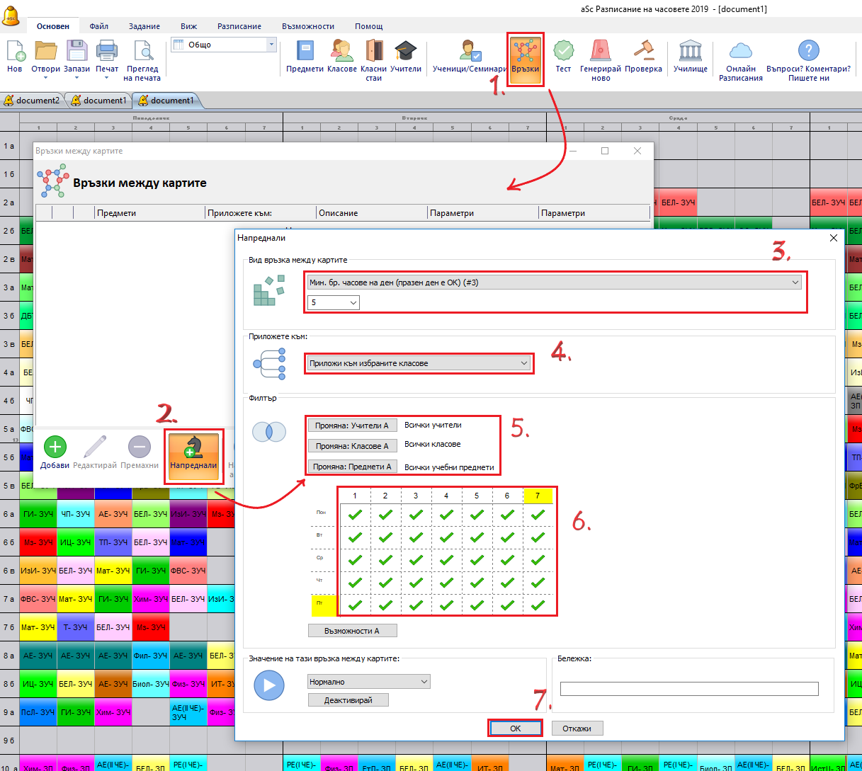 Ако използвате автоматичен блок с учебни часове, се изчислява като 6-8 часа на ден; софтуерът няма да постави девети час на ден. Но можете да обозначите, че желаете максимум седем часа. Отворете меню Класове/Органичения/Напреднал:
