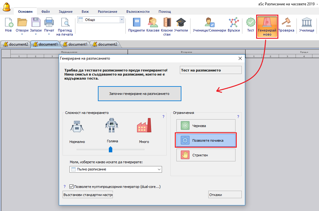 2. Може да ви помогне да намерите финалното разписание само с няколко освободени ограничения. Ако превключите освобождаването на ограниченията на стриктни, тогава нито едно ограничение няма да може да бъде освободено и само онези разписания, които напълно съответстват на вашите изисквания ще се приемат. Софтуерът ще генерира докато намери такова, или ще остави някои карти без настройка в случай, че такова разписание не съществува.