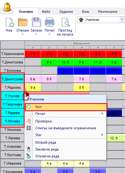 Можете да тествате много класове/ учители/ класни стаи/ учебни предмети/ ученици по този начин: FПърво, отворете съответния изглед (Цяло разписание/ Учители/ Класни стаи/ Предмети/ Ученици).