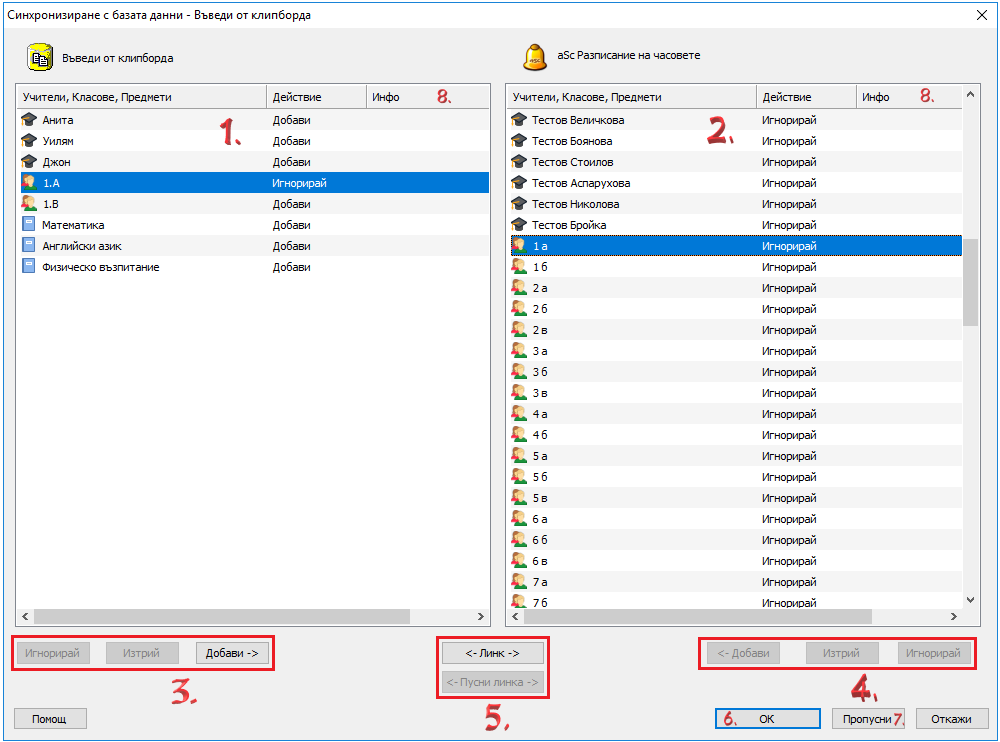 Диалоговата кутия показва различията между данните (учители, класове и др.) в aSc Разписание и базаданни. Левият списък показва данни от базаданни, които ги няма в разписанието, или са в разписанието, но се различават по нещо (например, различно име, съкратено име и др.). Десният сипък 2 показва, че данните са само в aSc Разписание, или че данните от разписанието се различават от тези в базаданни. Вашата задача тук е да прегледате или промените действията 8 за всяка редица в двата списъка. Можете да направите това като кликнете на бутона долу. Бутон 3 ще промени действие в списък базаданни 1, а бутон 4 в списък 2 на разписанието. Бутон 5 се прилага и при двата списъка (трябва да изберете един обект от всеки списък).