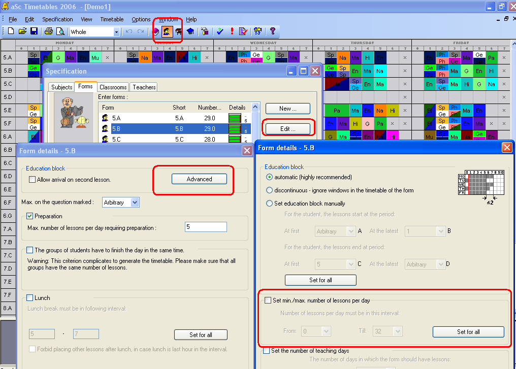 Así que si utiliza el bloque automático que calcula 6-8 al día, el software no pondrá 9 lecciones al día. Sin embargo puede especificar que quiere como máximo 7 lecciones. Vaya al menú Especificación/Clases/Detalles/Avanzado: