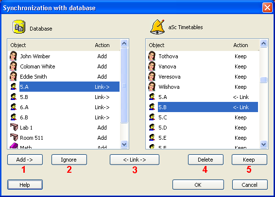 El diálogo muestra diferencias entre los datos (profesores, clases, etc...) en aSc Horarios y la base de datos. El panel izquierdo muestra los datos en la base de datos que no está en aSc Horarios o que está en aSc Horarios, pero difiere de alguna manera (p.ej. otro nombre, abreviatura, etc...). El panel derecho muestra los datos que están sólo en aSc Horarios, o los que son diferentes en aSc Horarios y en la base de datos. Los botones de abajo le dan opciones (acciones) de cómo resolver estas diferencias. Opciones 1-2 se usan para objetos en la base de datos, opciones 4-5 se usan para objetos en aSc Horarios y la opción 3 vale para las dos partes.