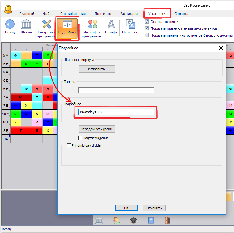 Примечание: Программа поменяет местами уроки двух выбранных дней. Уроки в другие дни будут нетронуты. Также эта команда не изменит рабочее время учителей, классов, кабинетов и предметов.