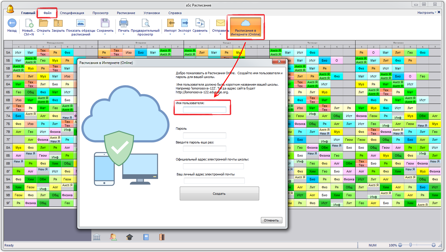 введя имя пользователя (совпадает с выбранным названием веб-страницы) и пароль или прямо из программы aSc Расписания (компьютер должен быть подключен к Интернету).