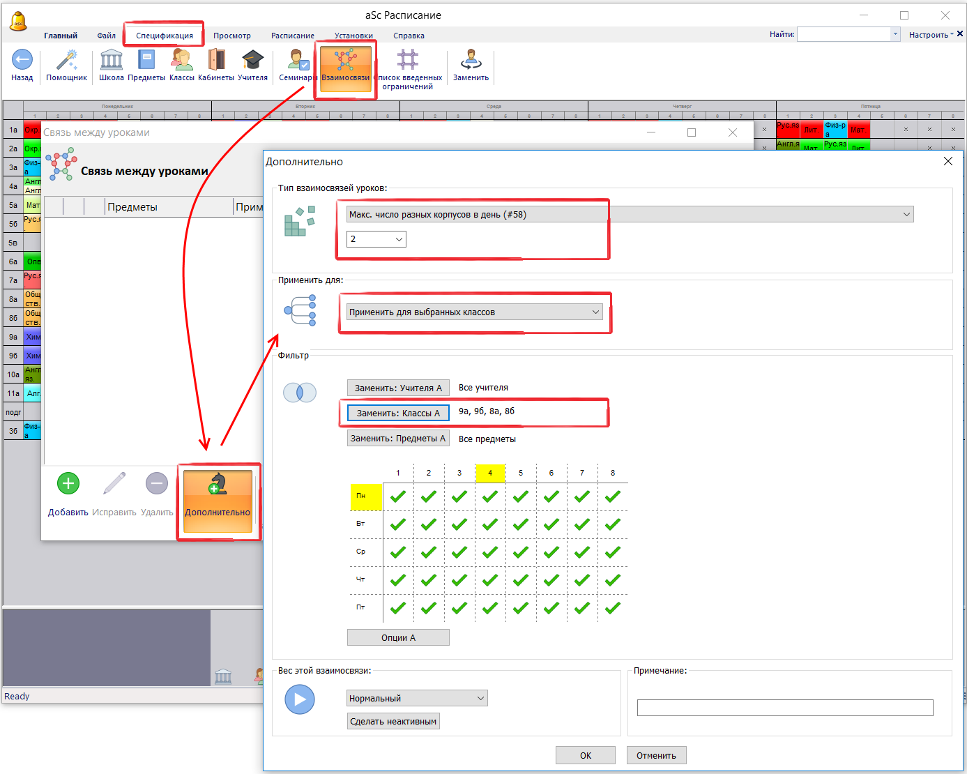 Для любых классов/учителей/предметов или же отдельных учащихся Вы можете указать максимальное число различных корпусов тот день, когда данный объект должен иметь уроки.