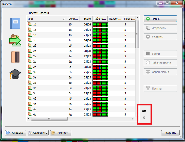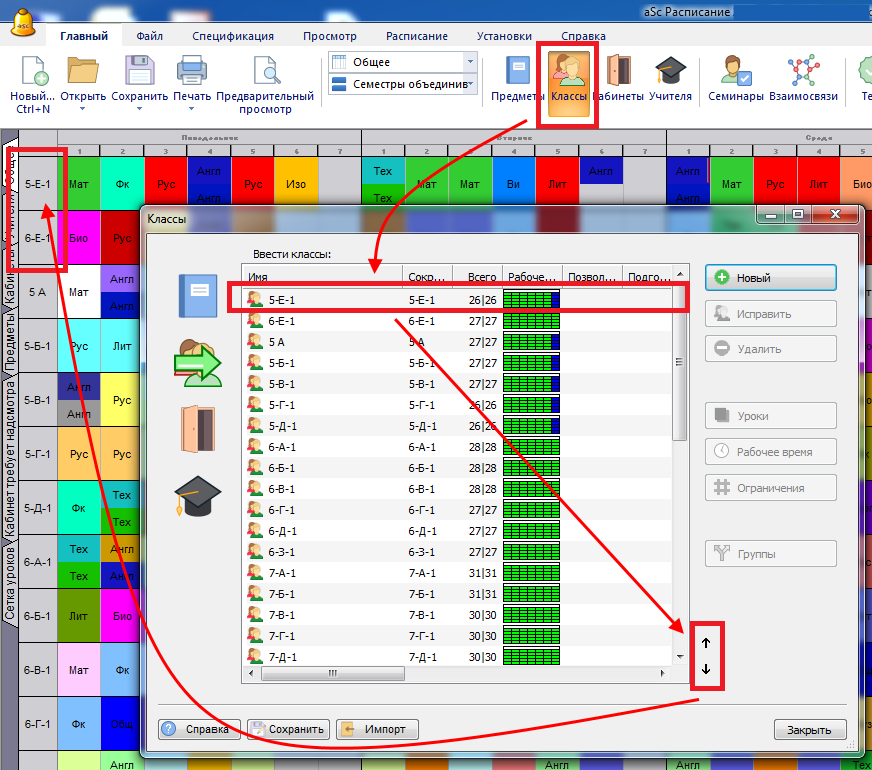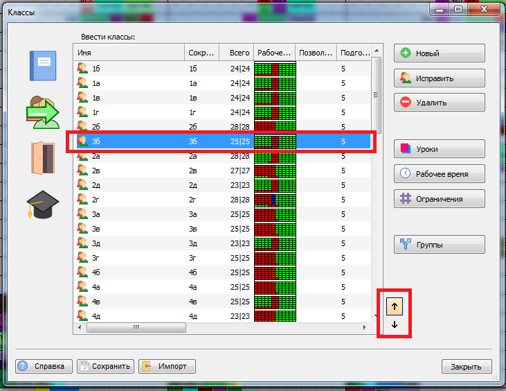 Используя две маленькие стрелки в правом нижнем углу окна, можно перемещать выбранную строку (учителя/предметы/классы/кабинеты).