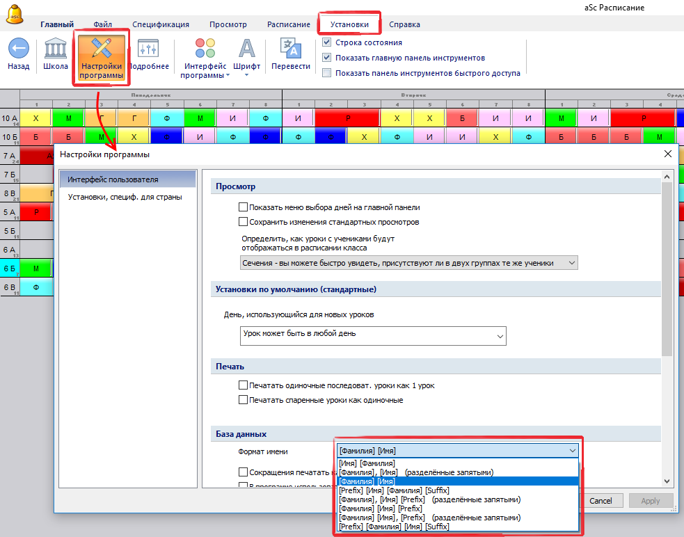 Чтобы это исправить, необходимо настроить формат имен в программе aSc Расписания. Вы можете сделать это в меню "Установки", "Настройка программы", "Интерфейс пользователя", "База данных", формат имени и фамилии.