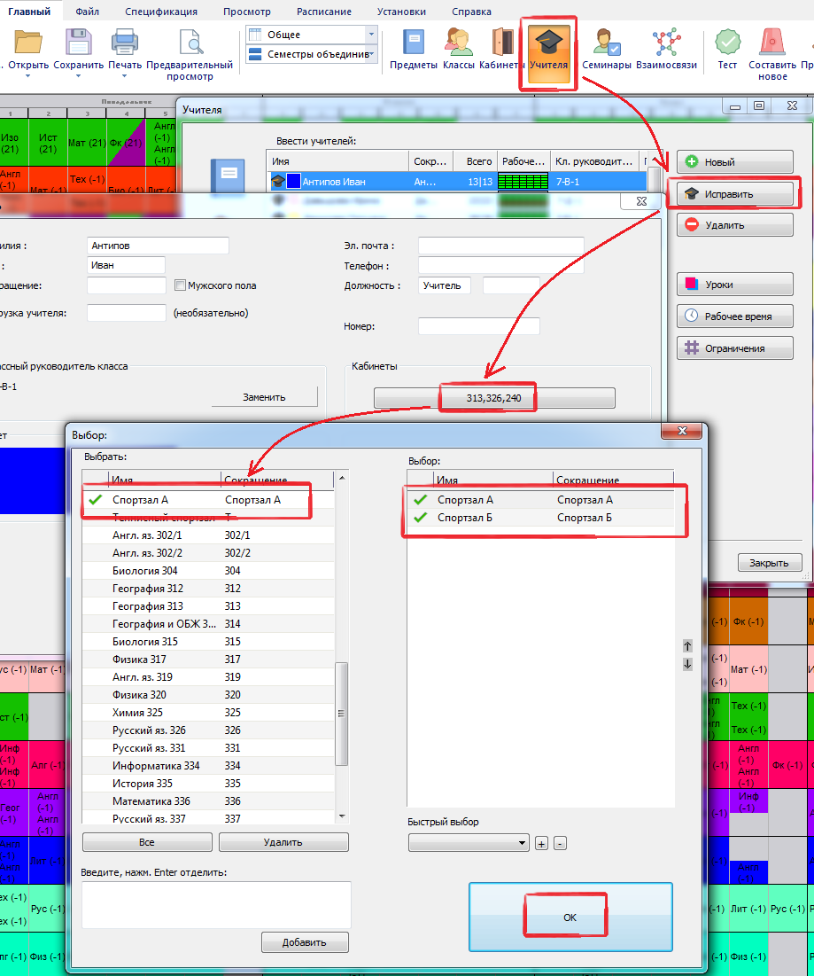 Примечание: если предмет имеет собственный кабинет (или кабинеты), тогда этому кабинету отдается предпочтение, а кабинет учителя не принимается во внимание.