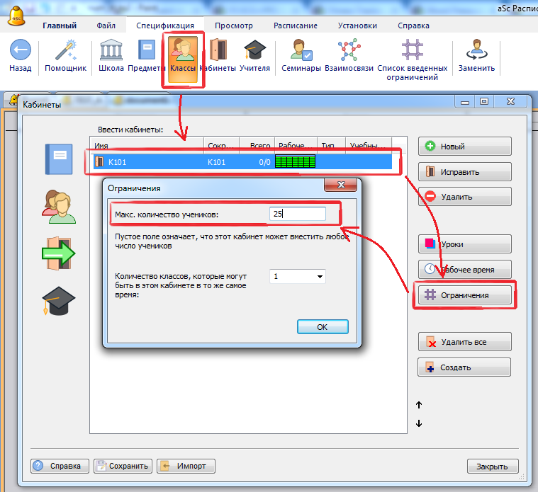 Примечание: Эту информацию вводить не обязательно. Определите вместимость кабинетов только для тех кабинетов, в которых могут возникнуть проблемы. Например, для маленьких кабинетов. Обычно достаточно определить возможные кабинеты для каждого урока.