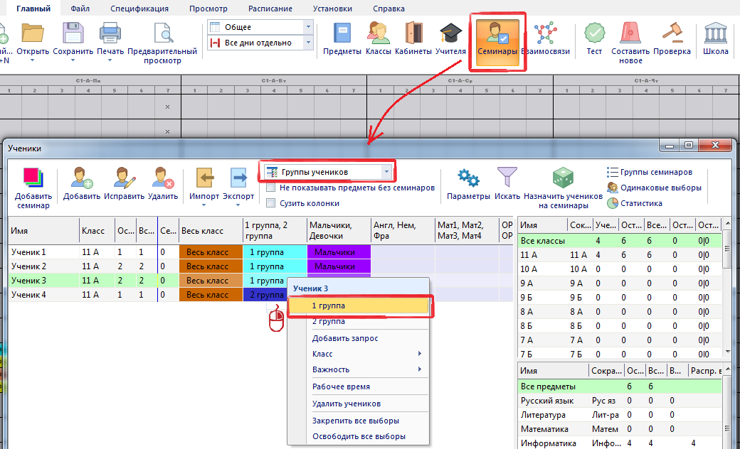 Вы можете указать группы в окне "Семинары":