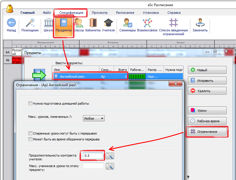 Если вы также хотите, что такие уроки шли только в указанное время, например, 0,5 уроки были только первыми, укажите это в окне рабочего времени предмета.