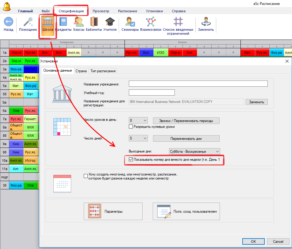 Для того, чтобы в распечатках был номер дня недели, а не его название, перейдите в меню "Спецификация / Школа" и поставьте галочку, как показано на картинке: