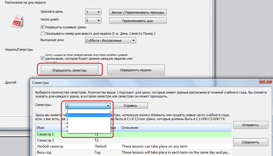 Можно определить и специальные семестры. Если указали что у вас есть 4 семестры, программа автоматически добавит еще два, Semester 1 и Semester 2. Semester 1 - это T1 И T2, и если вы для урока указали S1 то он будет проходить на обоих семестрах T1 и T2 в тот же день и то же время.