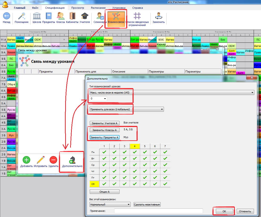2. Однако вышеуказанное взаимоотношение будет обеспечивать, чтобы не было окна между уроками музыки у 5А и 5Б классов если уроки музыки проходят в тот самый день. Поэтому, добавим взаимосвязь, что эти уроки должны быть в один день: