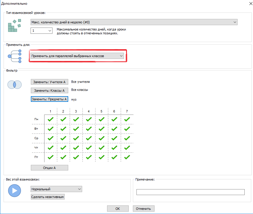 Допустим, Вы хотите, чтобы все уроки музыки для всей параллели классов были в тот же день.