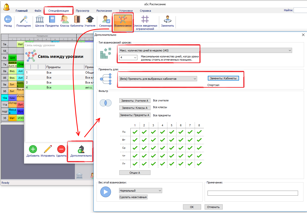 Таким образом вы можете указать, например, не более 2 уроков во второй половине дня, это будет означать, что спортивный зал свободен 3 раза в неделю в послеобеденное время (или во время второй смены), если обучение проходит с понедельника по пятницу.