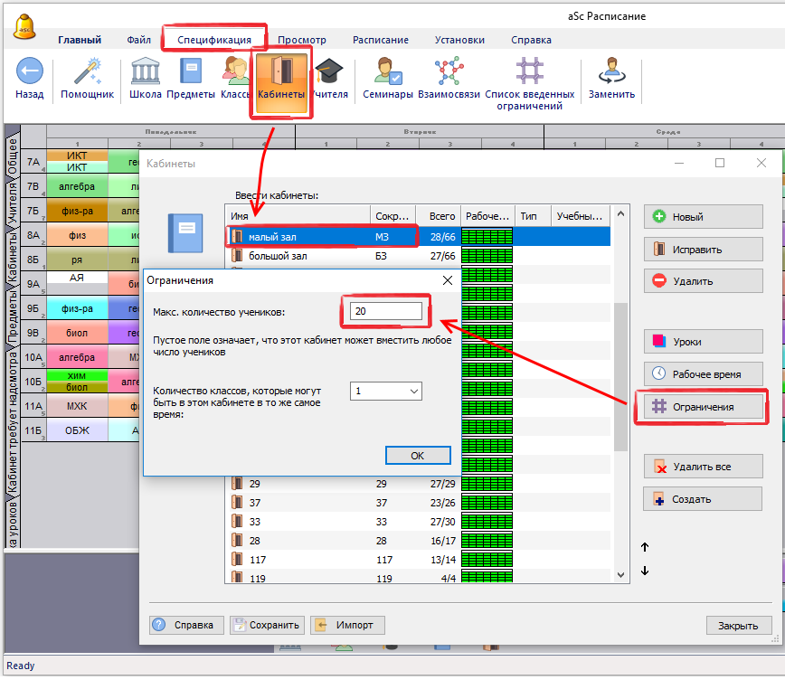 При составлении расписания, программа будет учитывать вместимость кабинетов, а также предупредит вас, если вы поместили большой класс в маленький кабинет: