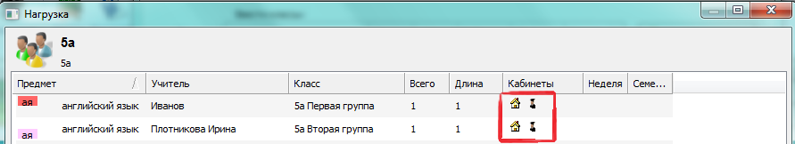Но, если Вы забыли определить кабинет для учителя, то в результате обе группы могут обучаться только в основном кабинете. Другими словами, эти два урока не могут быть расположены в то же самое время, так как они требуют один и тот же кабинет.