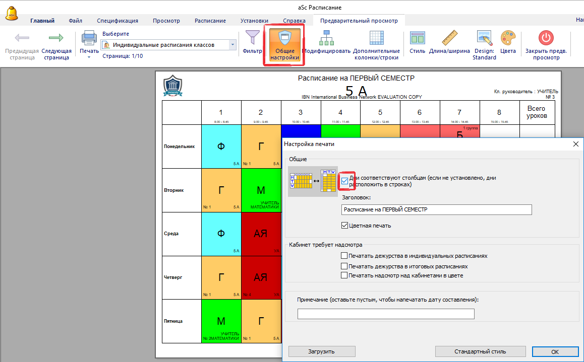 По умолчанию программа печатает индивидуальные расписания для учеников, классов или кабинетов так: строки соответствуют дням, а столбцы - №№ уроков.