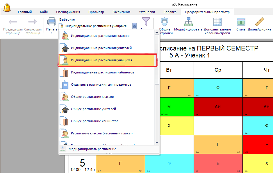 Как печатать расписание для отдельных учеников?