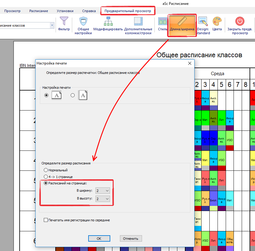 Выберите иконку "Длина/ширина". Здесь вы можете указать, сколько расписании должно быть напечатано на одном листе бумаги. Это может помочь сэкономить бумагу при печати расписаний для учащихся или классов.