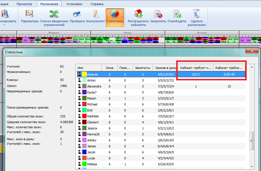 Примечание: надо ввести, что хотя бы для одного кабинета нужен надсмотр, иначе это поле в окне подробной информации учителя не будет видно.