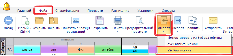 2. Выберете Файл/Импорт/aSc Расписание: